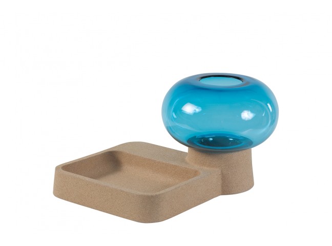 Deneb is a stylish. limited edition vase designed by Guillaume Delvigne. It features a blue, blown glass vase anchored in a tray made from cork. The catch-all tray also acts as the vase’s base.