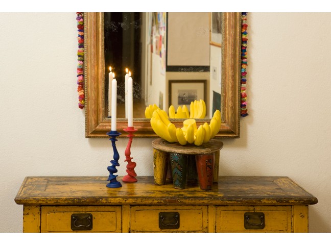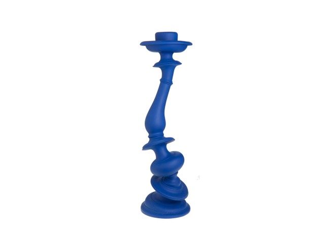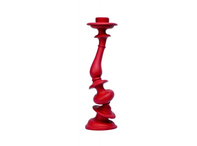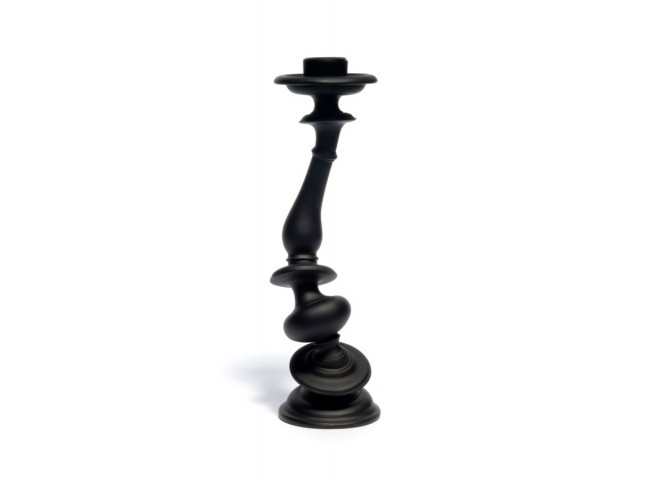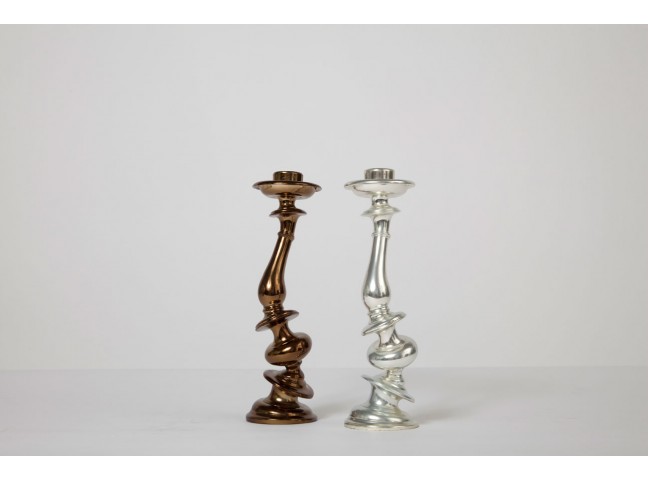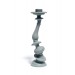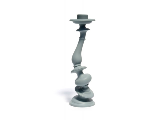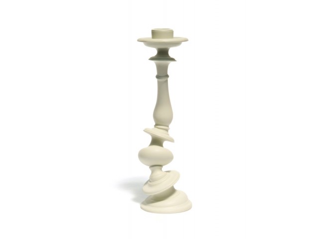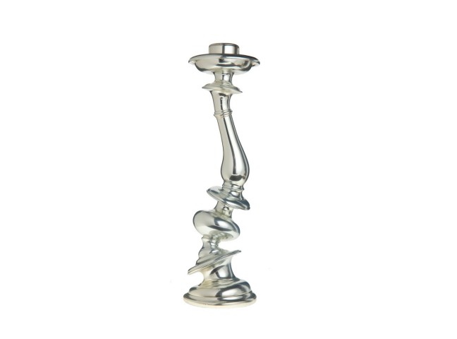 A traditional candlestick form is distorted through a 3D rendering program, rapid prototyped, then cast.