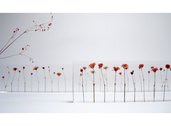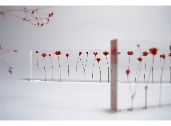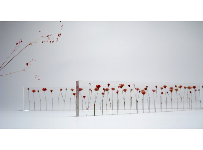 Norihiko Terayama's f,l,o,w,e,r,s is an acrylic ruler made with small dried flowers, each stem meticulously placed by hand one centimeter apart.