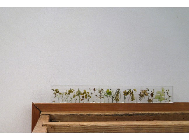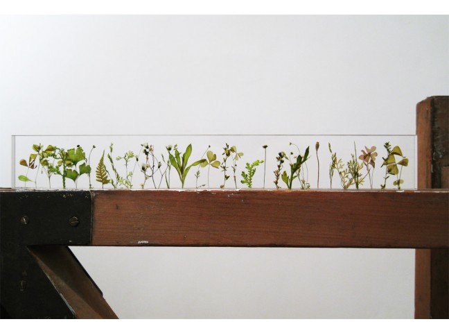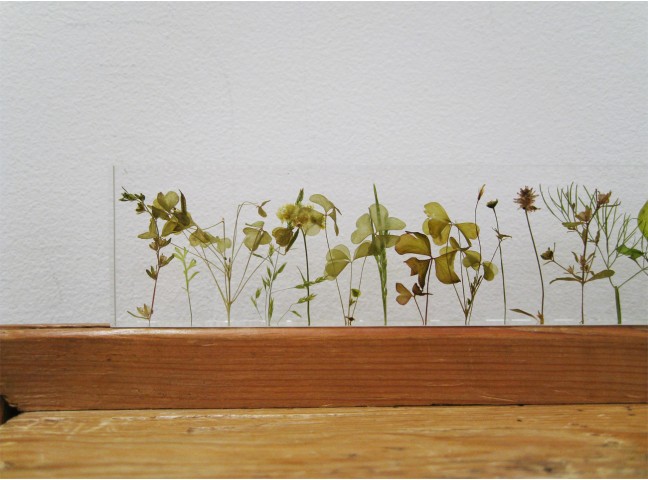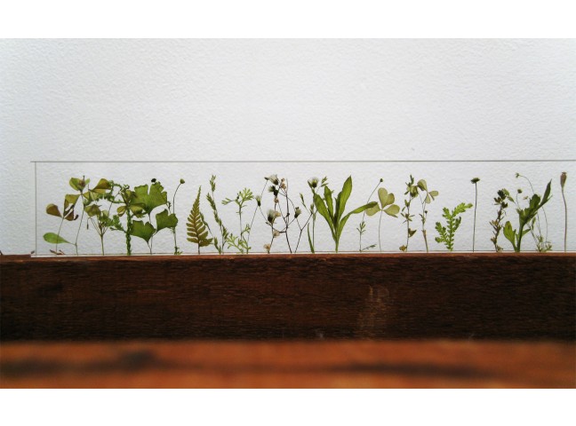 Norihiko Terayama's g,a,r,d,e,n is an acrylic ruler made with small wild flowers, each stem meticulously placed by hand one centimeter apart.