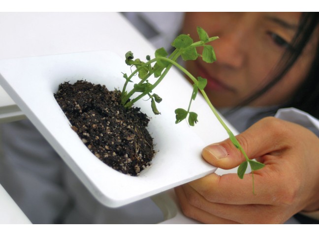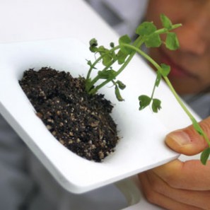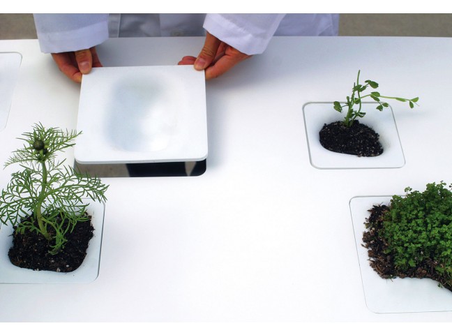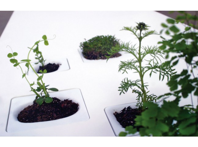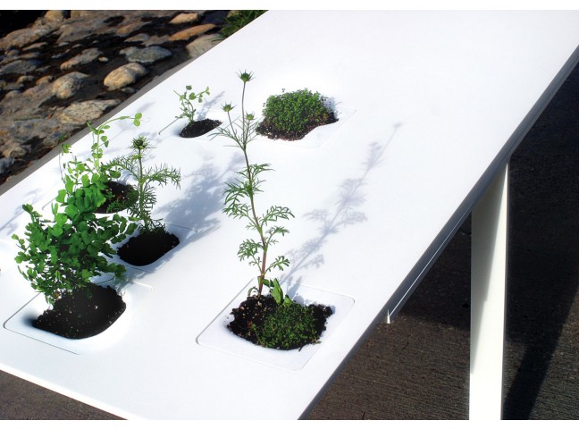 An unforgettable table, featuring plastic inserts that drop into the table to form functional little landscapes.