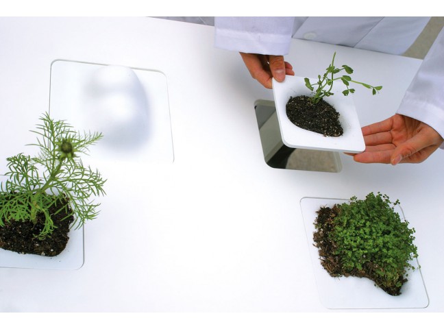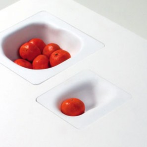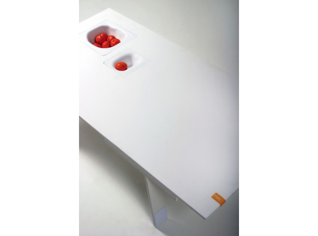 If you're tired of perfectly flat tables you'll love TOPO, a series of Corian tables with built in, reconfigurable landscapes. Molded plastic inserts drop into the table to create functional topographies that make a home for plants, paper-clips, oranges, you name it.
