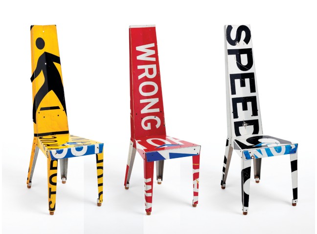 Made entirely of recycled street signs, these striking chairs look great around a kitchen table, or make a powerful statement on their own. Completely constructed, finished and sealed by hand.