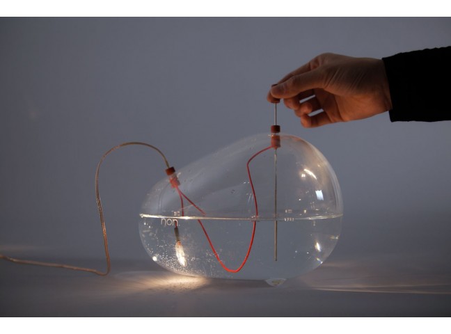 Putting an exposed light bulb in water certainly raises some eyebrows, but it also creates an intriguingly simple dimmer switch. When a thin silver rod is slid into the water, the WET Lamp turns on and becomes progressively brighter as the rod is submerged